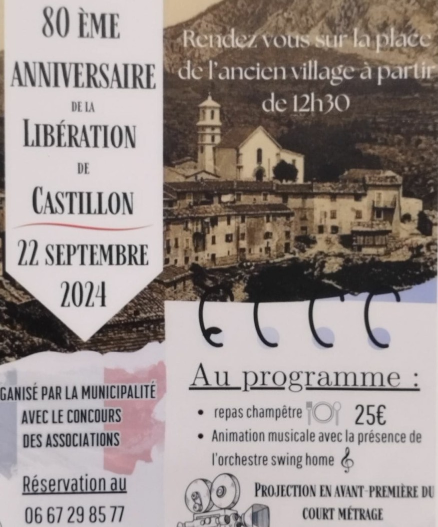 Monsieur Olivier Chantreau, Maire de Castillon, et le conseil municipal vous invitent à participer au 80e anniversaire de la libération de Castillon le dimanche 22 septembre à partir de 10 heures.