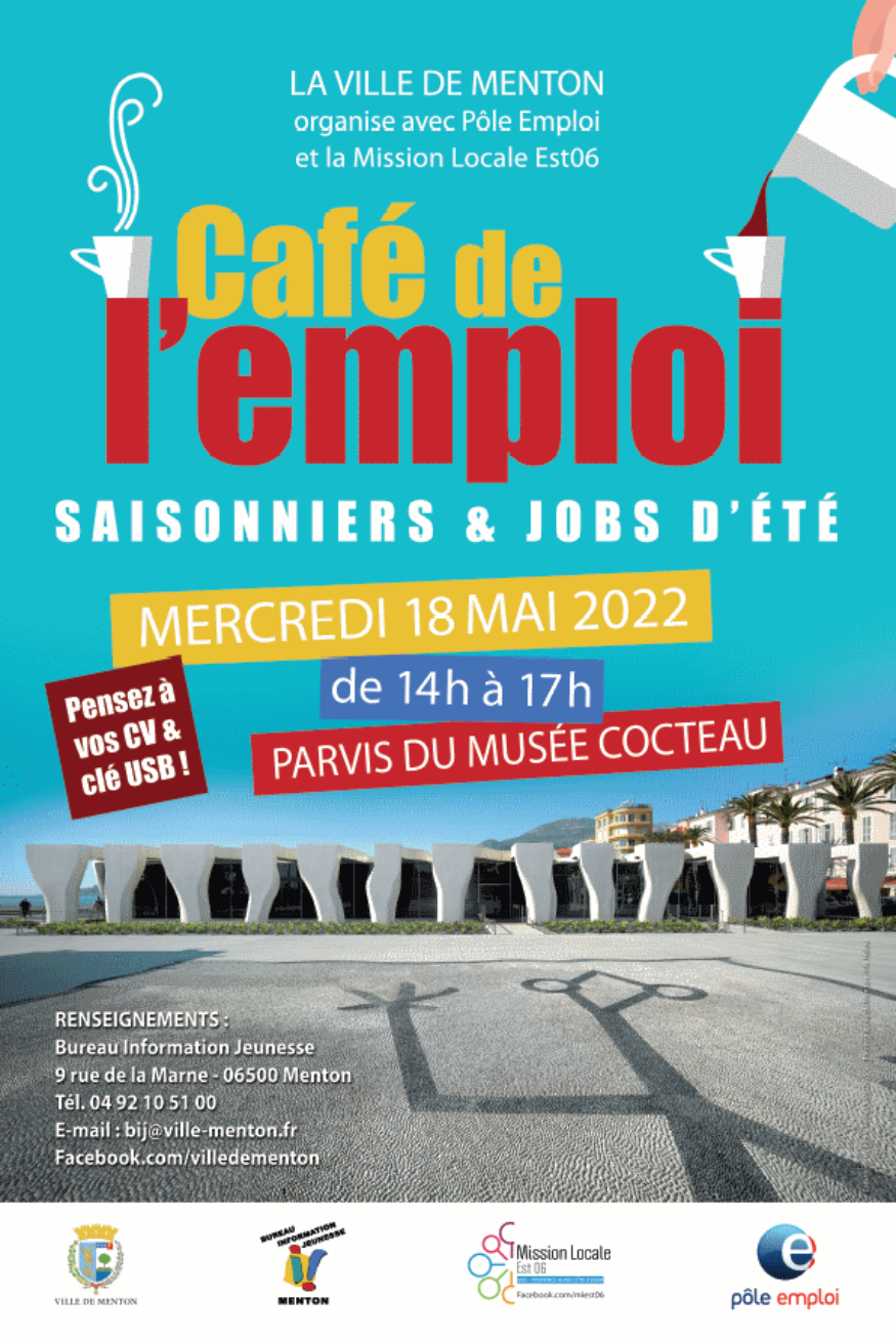 Comme chaque année, la Ville de Menton vous donne rendez-vous sur le parvis du musée Cocteau pour son Café de l'emploi.