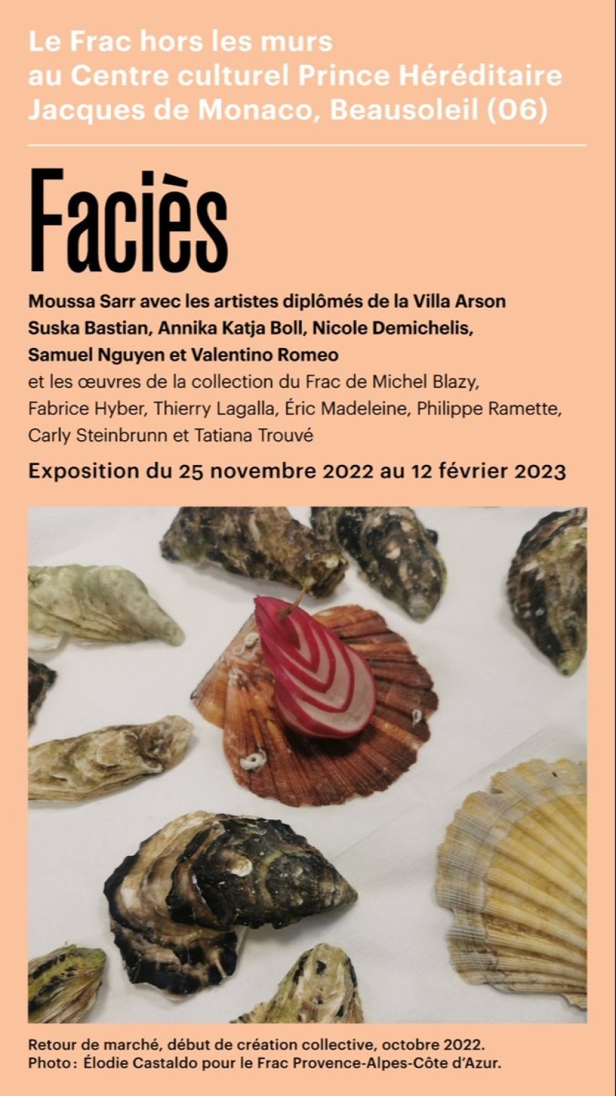 Moussa Sarr avec les artistes diplômés de la Villa Arson Suska Bastian, Annika Katja Boll, Nicole Demichelis, Samuel Nguyen et Valentino Romeo et les œuvres de la collection du Frac de Michel Blazy, Fabrice Hyber, Thierry Lagalla, Éric Madeleine, Philippe Ramette, Carly Steinbrunn et Tatiana Trouvé..