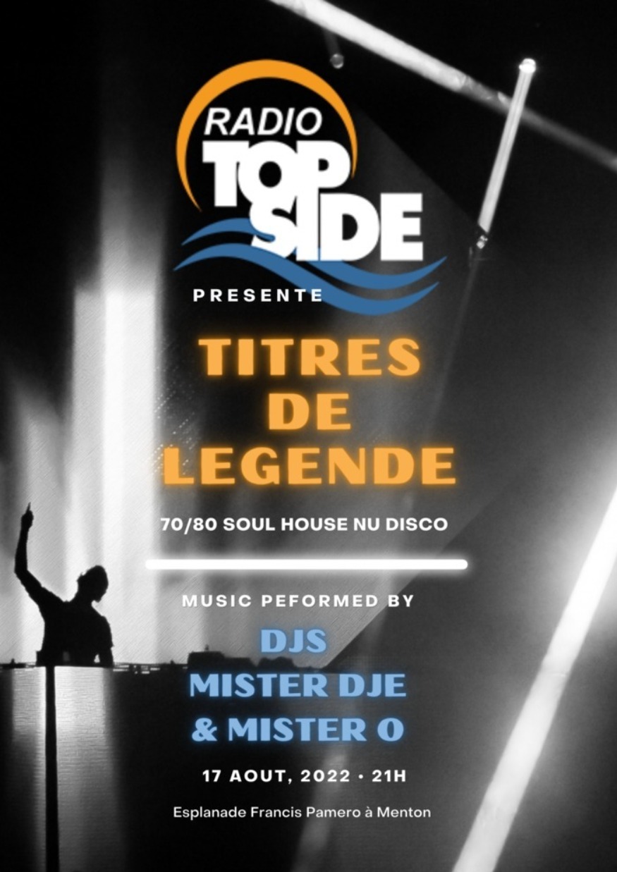 Animée par les Dj’s de Radio Top Side, mercredi 17 Août sur l’esplanade Francis Palmero à 21h30 à 23h30.
