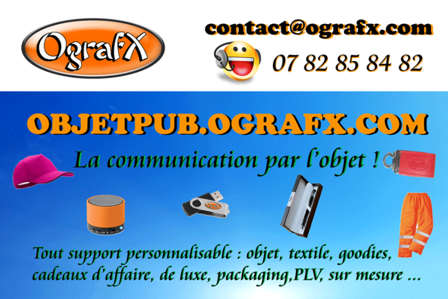 Personnalisez des objets à vos couleurs Les techniques de marquage sont adaptées à chaque article et à chaque client (nombre de couleurs des logos, emplacements, ...). Les prix affichés sont donc hors marquage. N'hésitez pas à nous contacter directement pour une étude personnalisée de vos besoins. Cette liste n'est pas exhaustive, nous pouvons vous proposer bien d'autres produits, selon vos désirs, vos directives, votre budget, et bien sûr vous conseiller, vous accompagner, pour votre entière satisfaction. OgrafX présente également, en plus de son site......